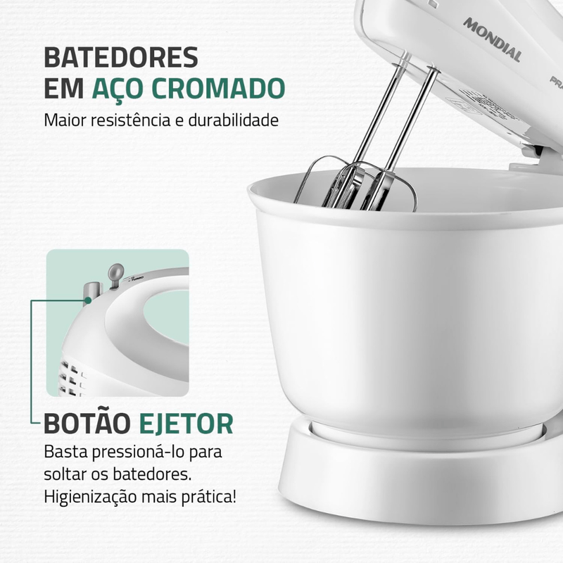 BOTÃO EJETOR: Basta pressioná-lo para soltar os batedores. Higienização mais prática e fácil.