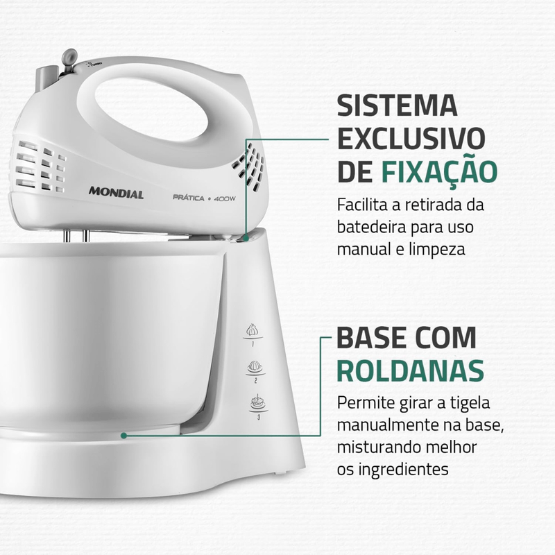 SISTEMA EXCLUSIVO DE FIXAÇÃO: Sistema desenvolvido pela Mondial para facilitar a montagem da batedeira e sua limpeza.