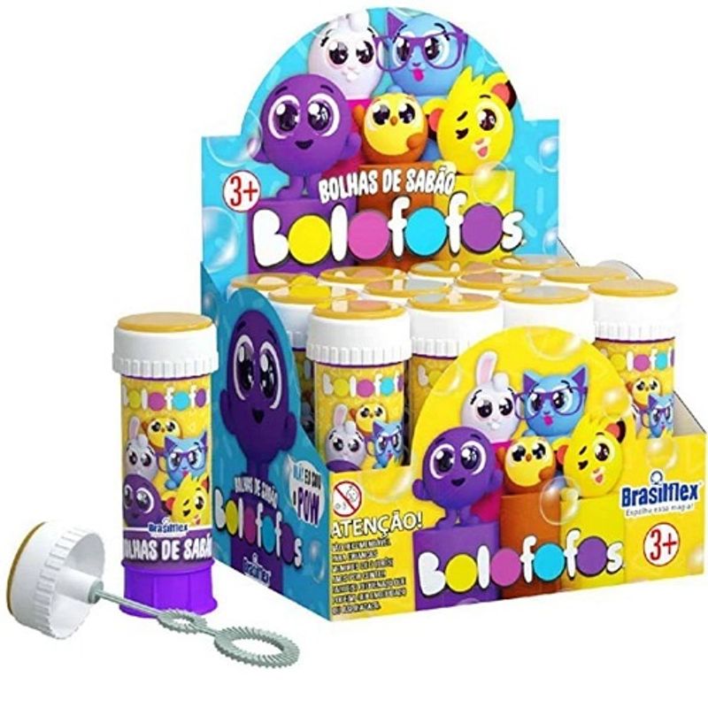Bolha de Sabao Infantil Bolofofos Com Joguinho na Tampa. Bolhas de Sabão em embalagem plástica muito resistente com uma linda ilustração em cores vivas e de alta resolução. O pote contém 60 ml de líquido para fazer bolhas.