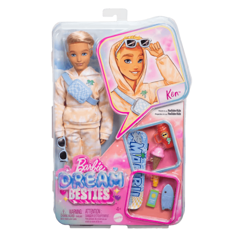As bonecas Barbie Dream Besties™ incentivam as crianças a viverem seus sonhos e compartilharem seus talentos com o mundo, assim como o Ken! Neste modelo, Ken sonha em criar vídeos virais sobre o meio ambiente e a proteção dos animais, combinando estilo, diversão e consciência ecológica. O boneco vem com roupas modernas e articuladas, além de 9 acessórios incríveis que estimulam a imaginação durante as brincadeiras, como skate, pochete, celular com capa em forma de prancha de surfe, garrafa de água, óculos de sol e muito mais!