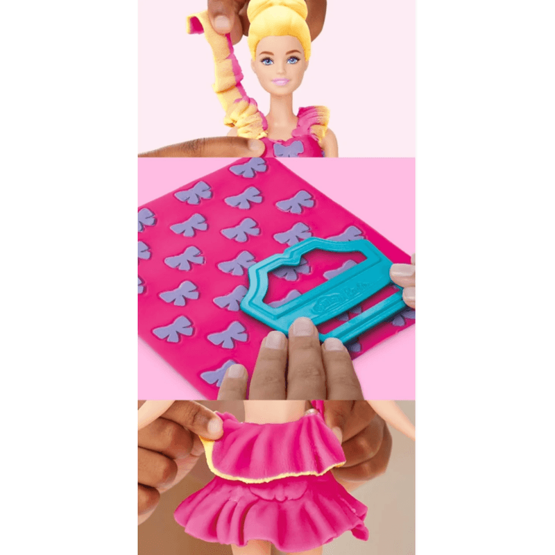 É fácil e divertido criar roupas de Barbie com Play-Doh usando este kit de arte e artesanato. Basta colocar a boneca no suporte, usar a folha de padrões Play-Doh e os cortadores para criar vestidos da Barbie e vesti-la das formas mais criativas que imaginar. Dê a ela diferentes penteados Play-Doh com o molde de cabelo, ou as crianças podem criar seus próprios estilos manualmente. Complete o visual com acessórios da Barbie, como bolsa e sapatos. Mantenha a brincadeira criativa com 2 potes de massa de modelar Play-Doh para adicionar ainda mais detalhes.