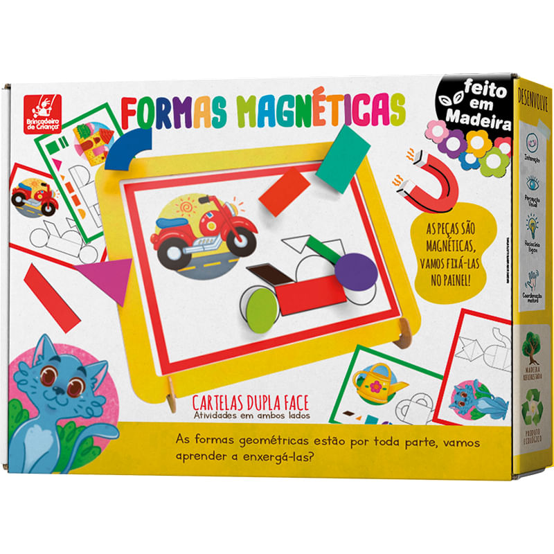 Uma atividade divertida com 24 peças magnéticas de diversas cores e com silhuetas de formas geométricas. Esse brinquedo possui 10 atividades propostas, e as crianças podem também brincar livremente fixando as formas no painel e formando figuras.