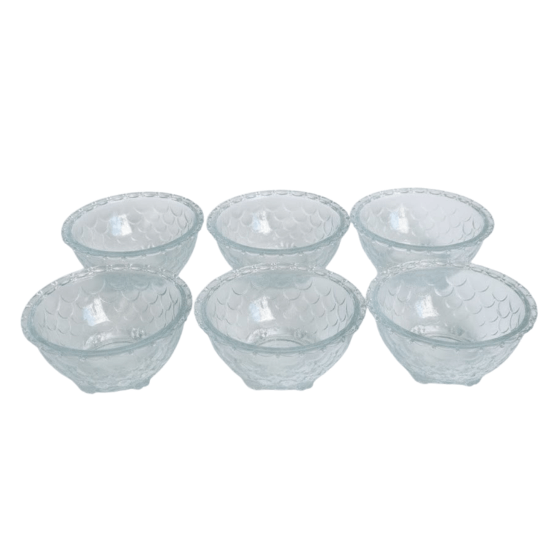 Este elegante conjunto de sobremesa da Rayan é a escolha perfeita para servir suas delícias com estilo e sofisticação. Composto por seis taças de vidro, cada peça apresenta um design clássico com uma textura de escamas de peixe, que adiciona um toque de charme e requinte à sua mesa.