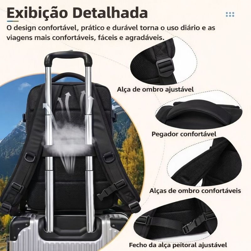 A Mochila Executiva de Viagem com Expansor e Vácuo foi desenvolvida para quem exige organização, tecnologia e proteção máxima em deslocamentos profissionais ou viagens longas. Fabricada em nylon emborrachado de alta resistência, ela une design moderno com funcionalidades inteligentes que transformam sua experiência de viagem. Seu grande diferencial está no compartimento com compressão a vácuo, que reduz o volume das roupas em até 30%, permitindo transportar peças para vários dias sem ocupar espaço excessivo. Além disso, o sistema expansível amplia a profundidade de 20cm para 26cm, adaptando-se facilmente às suas necessidades. Pensada para o dia a dia corporativo, conta com compartimento exclusivo para notebook de até 17” com elásticos de fixação, bolsos organizadores internos, espaço para itens molhados, além de bolso antifurto nas costas e cadeado embutido, garantindo total segurança para documentos, eletrônicos e objetos pessoais. O conforto também é prioridade: costas e alças acolchoadas, design ergonômico e cinta para acoplar em malas de rodinhas, facilitando viagens longas e deslocamentos em aeroportos. O material totalmente impermeável protege seus pertences contra chuva e umidade, oferecendo tranquilidade em qualquer situação. Ideal para viagens de negócios, trabalho, estudos ou uso executivo diário, esta mochila combina elegância, inovação e funcionalidade em um único produto.