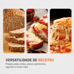 VERSATILIDADE DE RECEITAS: A panificadora automática Mondial prepara pães, bolos, pizzas, panetones, iogurtes, geleias e muito mais.